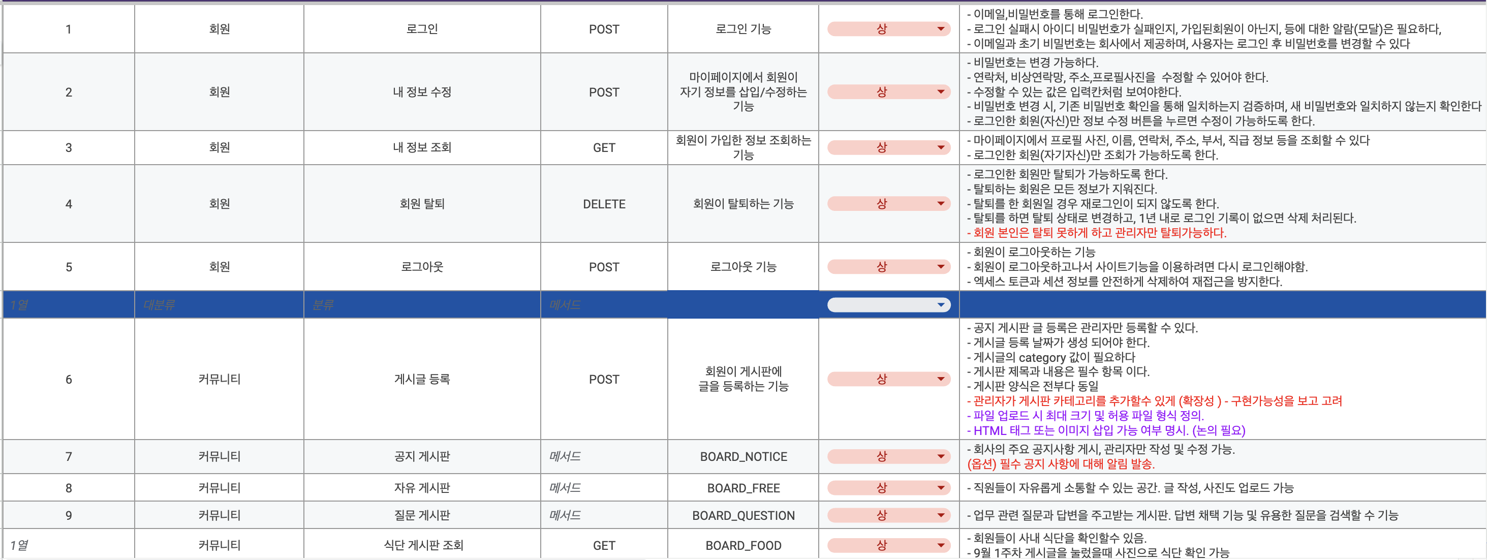 최종 프로젝트 4일차회의록✍ 주요안건주말까지 요구사항 분석서, API 명세서, ERD 완성하기외부 API와 통신하기 위한 Spring Cloud OpenFeign 사용할 것인지API Gateway - Kong, Spring Cloud Eureka 중에 선택📑 회의 내용ERD테이블 설계 및 연관관계 설정dbdiagrams로 진행FrontReact Admin Dashboard는 Github에서 가져오기📢 회의결과MSA 관련한 공부 주말까지 완료해서 월요일에 시작하기API Gateway는 가장 대중적인 Spring Cloud Eureka로 진행