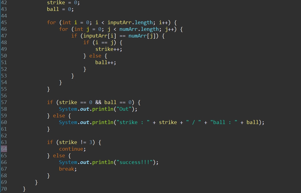 strike와 ball을 0으로 초기화해주고, 사용자 입력 세 자리를 배열로 만들었습니다.